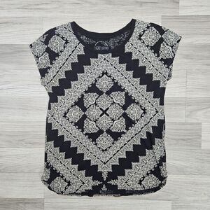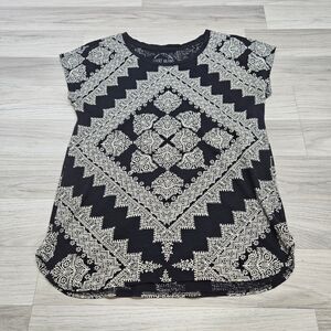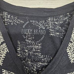 This Lucky Brand women's t-shirt in size Small features a tribal Western print in black. It has a round neckline, short sleeves, and a regular fit. The pullover style shirt is machine washable and suitable for all seasons due to its lightweight and breathable fabric. Perfect for casual occasions during summer, fall, and spring.