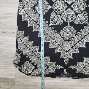 This Lucky Brand women's t-shirt in size Small features a tribal Western print in black. It has a round neckline, short sleeves, and a regular fit. The pullover style shirt is machine washable and suitable for all seasons due to its lightweight and breathable fabric. Perfect for casual occasions during summer, fall, and spring.