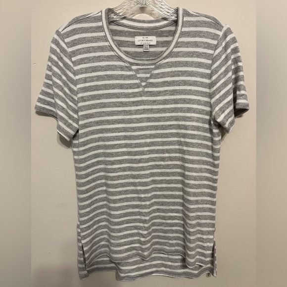 Lucky Brand Women’s Crew Neck Gray/White Striped Short Sleeve Tee, Soft; Size XS