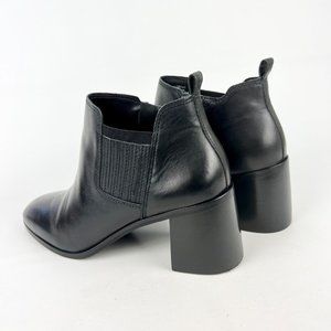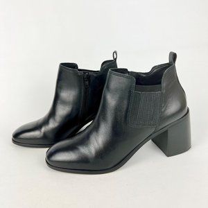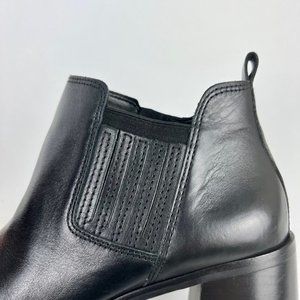 Set on a woody block heel, the Debruh leather bootie features Chelsea Boot-inspired styling, flexible side elastic panels, a heel loop pull and an easy zipper closure for a put-together, laid-back look.