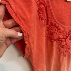 Stylish women's top featuring a beautiful ombre design with intricate embroidery. Lucky Brand. Size M. Orange ombré.