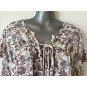 Keywords: Lucky Brand, women's blouse, floral pattern, linen blend, casual wear, spring fashion, tie neckline, short sleeve, multicolor, machine washable, pre-owned, regular fit, casual occasions, versatile style, easy care.