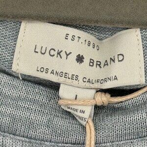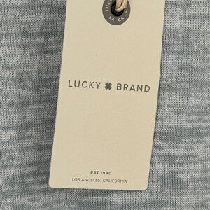 This Lucky Brand women's grey top is a chic and comfortable pullover style. It's a size large, featuring a unique tie-front design and soft knit fabric. Perfect for casual wear, it's brand new.