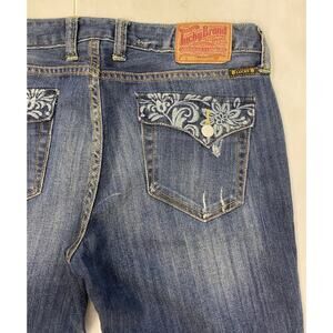 Lucky Brand women’s jeans, style Sweet N Low. Tag size 14/33, actual measurements 34x32. Medium wash blue denim with embroidered flap back pockets, mid-rise fit, and slight stretch for comfort. Zip fly with button closure.