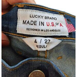 These distressed Lucky Brand jeans offer timeless style with a comfortable mid-rise fit.