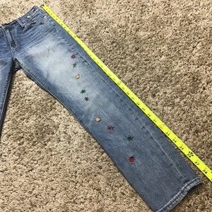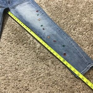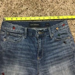 Lucky Brand Ava Skinny Lady Bug Embroidered Skinny Jeans. In fantastic shape with great factory distressing. Embroidered super cute lady bugs embroidery. Marked size 2/26 but please check the photos with the tape measure to ensure proper fit before purchase. If more measurements are needed, please don’t hesitate to ask!