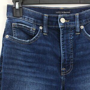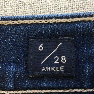 Size 6 high rise medium wash skinny Bridgette ankle denim jeans (left pictured), two side slip pockets, belt loops, button zipper front closure, two back slip pockets, leather logo tag on back, medium wash blue denim color, skinny leg, mild distressed look part of style, casual, simple, stylish, classic, comfortable