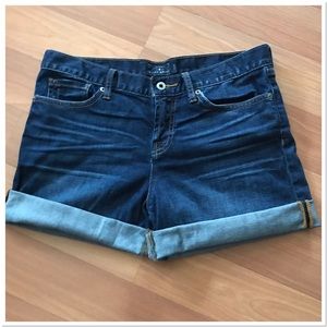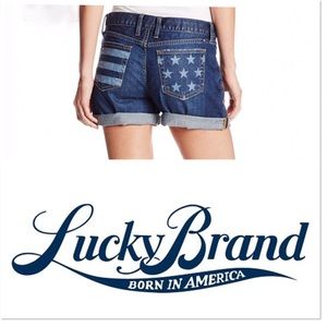 Lucky Brand Women's Laguna Short with Stars and Stripe Pocket In Dark Alley. These denim short features zip fly and button closure. Rise: 8 3/4 inches