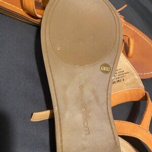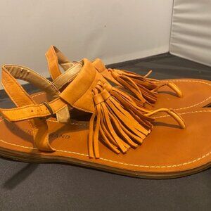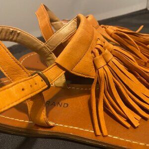 In like new condition (barely worn) is a trendy pair of Lucky Brand sandals, orange/tan leather, leather tassle, adjustable buckle strap, super cute, says size 8.5 but I wear between a 7.5 to an 8 and they fit me perfectly! As seen in picture a very tiny blemish in the leather on the inside of the strap.