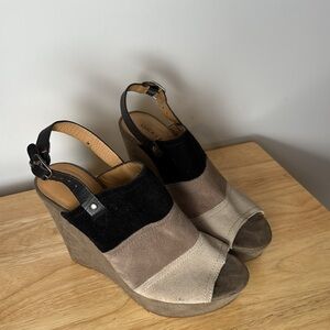 Lucky Brand, Frescala wedges, oiled suede, open-toe shoes, platform sandals, size 8.5, ankle strap, chunky heel, casual chic, comfortable footwear