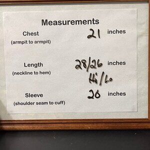 Chest = 21 inches, length = 28/26 inches, sleeve = 20 inches
