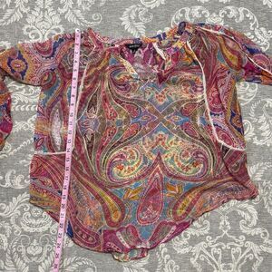 Discover the effortless charm of the Lucky Brand Women's Multicolor Paisley Blouse in Pink. This relaxed-fit blouse, crafted from lightweight fabric, offers a breezy feel perfect for any occasion. The vibrant paisley pattern adds a touch of bohemian flair, while the keyhole neckline, sheer pattern and long sleeves provide a stylish silhouette. Whether you're dressing up for a night out or keeping it casual, this versatile piece is your go-to choice. Please be aware that this blouse is pre-owned, adding a unique character to its appeal.