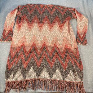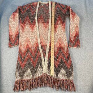 Lucky Brand Women's Size L Long Open Front Cardigan Sweater Southwestern Aztec Boho Fringe Bottom Chevron