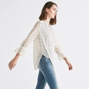 Fresh and feminine, this Lucky Brand button-down shirt features a charming mix print in cream and navy floral. Lightweight and breezy with semi-sheer long sleeves, subtle ruffle cuffs, and a relaxed silhouette—perfect for pairing with jeans, skirts, or layering under a jacket. Button-front design adds a touch of classic style, while the high-quality cotton-elastane blend offers comfort and a hint of stretch.