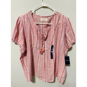 Lucky Brand Womens Stripe Split Neck Cotton & Linen Blouse