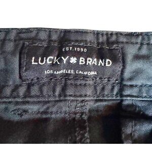 Lucky Brand women's black goth Y2k cargo pants. These pants are awesome! They have a mid rise fit with zipper and drawstring closure. The front has several pockets outlined with metal grommets or eyelets. The back does as well. Pants are made of a cotton elastane blend and are a woman's size 4/27.