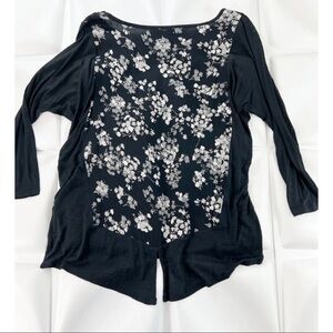 Lucky Brand Womens Sz M Black Floral Print Knit Tee Split Back Blouse Top