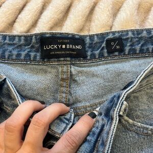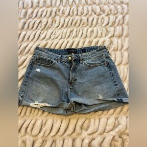 Trendy distressed jean shorts. Classic blue denim. Perfect for casual wear.