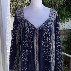 Lucky Brand Women's Top Size Med Blue White Boho Printed Peasant Long Sleeve