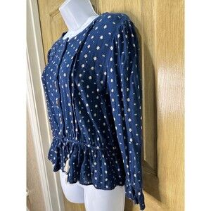 This Lucky Brand women's blouse is perfect for any casual or travel occasion. With a beautiful blue Aztec design on a gathered crop style blouse, it is both stylish and comfortable. The blouse features a round neckline with long sleeves and a regular fit. Lucky Brand blouse comes in size S and is a great addition to any wardrobe. Its basic style makes it versatile for any outfit choice. Whether you're going for a boho or cottagecore look, this blouse is sure to impress.