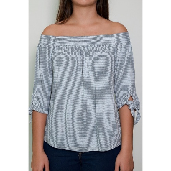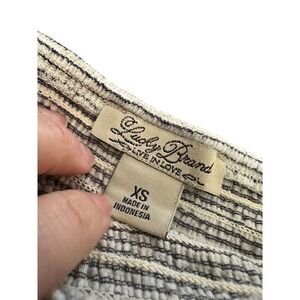 Keywords: Lucky Brand, off the shoulder, black blouse, women's fashion, striped pattern, long sleeve, tie accent, casual wear, breathable fabric, pre-owned, versatile style, elegant, comfortable, XS size, women's blouse.