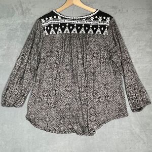 Lucky Brand Womens Top 2X Black Split V-Neck Embroidered Boho 3/4 Sleeve Knit