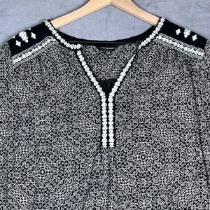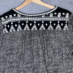 Add a touch of boho chic to your wardrobe with this stylish Lucky Brand top. This top features a beautiful black and white embroidered design with intricate detailing. The yoke is adorned with stunning embroidery, giving it a unique and trendy look. The 3/4 sleeves and split neckline add to its relaxed and comfortable style. Perfect for pairing with jeans or skirts for a casual yet polished outfit.