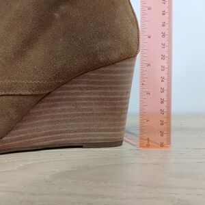 These Lucky Brand wedge booties feature a tan leather upper with lace-up front. Designed with a stacked wedge heel for a stylish lift.