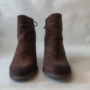 Lucky Brand Yamina in Java Oiled Suede. Worn no more than a dozen times. No flaws, just not a pair that I reach for often as my other boots bc the toe shape is a bit too round for my liking. Chocolate/java suede color with "oiled" heel and toe. Really cute bow detail (not adjustable) at the back of the heel. Side zip closure, approx. 3" heel.