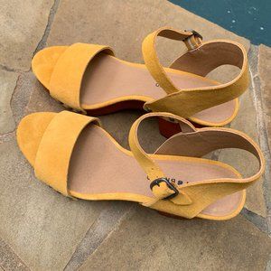 Elevate your style with Lucky Brand's yellow platform sandals, featuring a retro-inspired design with a chunky block heel and a comfortable platform front. Crafted from premium leather or suede, these sandals boast a striking mustard yellow hue complemented by a natural wooden sole. The ankle strap with a metal buckle ensures a secure fit, while the studded details add a touch of vintage charm.