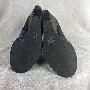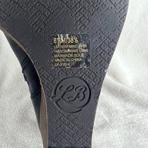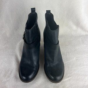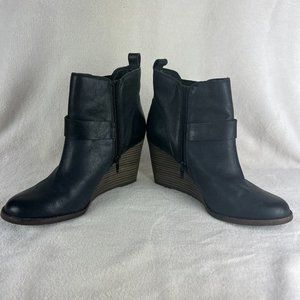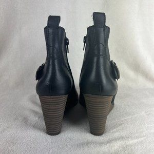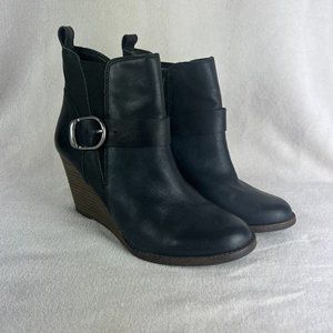 Lucky Brand Yishi Ankle Booties 8.5 Black Leather Stacked Wedge Zip Buck…