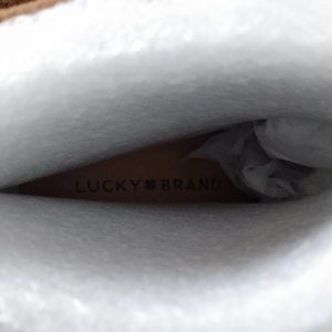 Women's US 8.5M. New in box. Color is Honey, oiled suede. Pull-on style suede fringed upper, man-made lining/sole. Approx. 2" stacked-look heel. Ships with box.