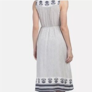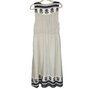 Lucky Brand navy blue and white sleeveless polka dot maxi dress with floral and stripe upper and lower trim banding. Tie at neckline with half dome buttons for closure to waistline. Stretch elastic waist. Great picnic, nautical, coastal Fourth of July. Summer, spring, vacation, beach dress. Size L