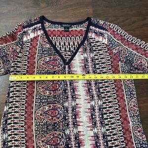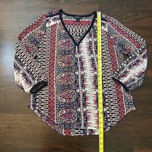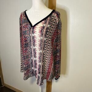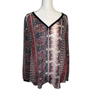 Lucky Brand cream, maroon & navy print long sleeve sheer top size L