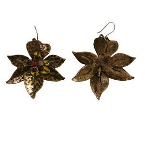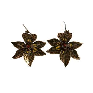 Antique textured finish gold color metal and stone earrings with a dangling bottom petal. From the early 2000s.