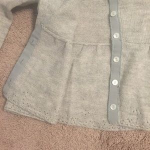 Cute light gray sweater. Nice detail with light blue ribbon where it buttons. Can be worn buttoned as a sweater or unbuttoned as a cardigan. Three-quarter length sleeves. I'm tall (5'8"), so I usually would wear a camisole under it, even if wearing buttoned. Runs small. In great condition.