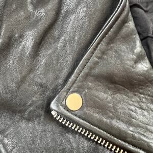 Lucky Brand women’s size M lamb skin leather jacket. Black with silver zippers and buckles. Arm pit to arm pit measures 19”. Length is 21”. Very soft leather! Very stylish!