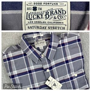 Lucky Brand new with tags Saturday Stretch Plaid Flannel Shirt Men L/G Gray Blue