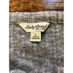 Lucky Brand ribbed knit lace up long sleeve pullover top, size L, lace up and tie front detail, lightweight knit, relaxed fit, rounded bottom hem, stretch.