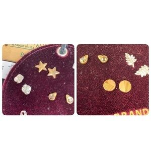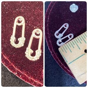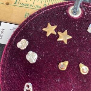 NWT Lucky earrings. All 7 pairs are adorable! The safety pins are the largest and measure about .5 inches by .25 inches. Small eats ones are the ones in the middle. 7 pairs in total. Materials unknown.
