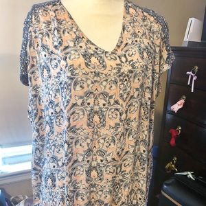 Lucky Brand short sleeved floral design top with loose fit and cinched waist in size 2X. Pairs well with jeans, shorts, skirts and tucked into a pair of overalls. Great for a casual day of errands or girls trip to the vineyard. Also can be dressed up for a day at the office.
