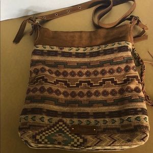 Beautiful Southwestern-inspired, woven print shoulder bag, trimmed in suede, with adjustable strap. One zippered outer pocket, one zippered inner pocket, two inner pouches. Small spot on interior fabric. Detachable woven leather tassel. Last pictures show condition of interior lining. 14.5” x 14” x 3”. Excellent condition.