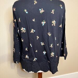 Lucky Brand top black long sleeve button front floral knit & lace hemline Sz XL