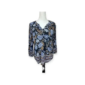 Lucky Brand top. Black background with blue and brown floral print. Long sleeves. Quarter Button front. V neck. Excellent preowned condition. Steamed and sanitized. Size medium.