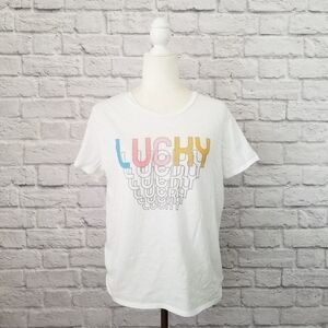 Lucky Brand t-shirt in white with multicolor graphic Lucky print on the front.