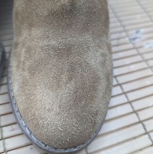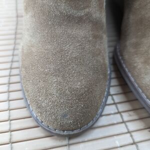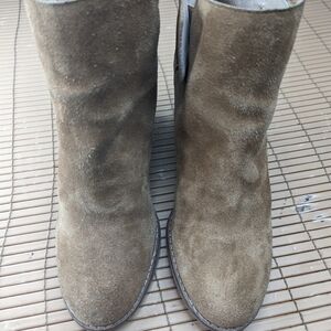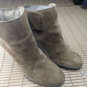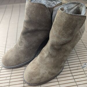 Lucky Brand women's sz 10M brown rough out suede pull on 3.5" stacked wedge heel ankle boots. some peeling of inside liner. see pics. 286pm