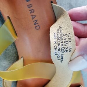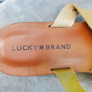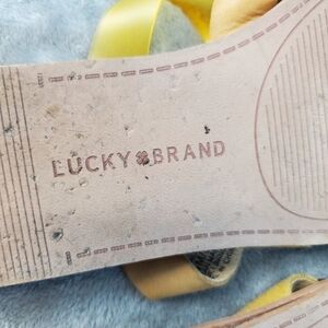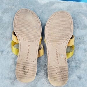 Lucky Brand yellow slides, tan insole and bottom, yellow straps (various materials, leather, suede and some sort of acrylic/plastic), size 5.5M, fair used condition upper portion of shoe is nice and clean with a few signs of wear but no issues, soles have some stains that can't be removed with washing, overall still very wearable and bright, price considers condition