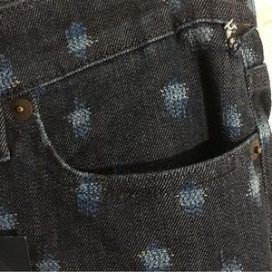 Dark Blue skinny jeans with abstract all over print. Front and back pockets. Has small imperfection as pictured. New with tags. Please refer to pictures for best description and condition verification.