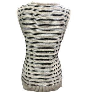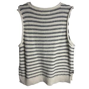 Lucky brand cream and black striped sweater vest, size large. Cream knit sweater with black stripes, sleeveless crewneck with slits on the waist, and plenty of stretch.