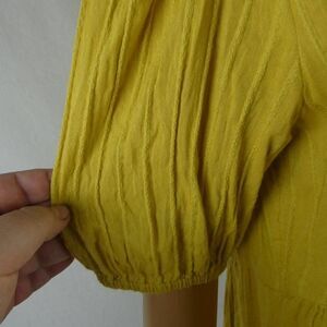 Machine washable cotton/viscose. Rich yellow with textured stripes, v neck, and short sleeves with elasticized cuffs. Babydoll skirted hem.